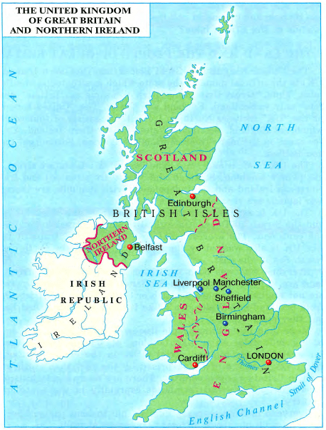 Объединенное королевство Великобритании и Северной Ирландии — это официальное имя государства, которое расположено на Британских островах. Таким образом, Великобритания — это чаще всего то же самое, что и просто Британия и это относится только к Шотландии, Англии и Уэльсу. Объединённое Королевство или ЮК включает в себя еще и Северную Ирландию. Она включает в себя четыре страны, такие как Англия, Шотландия, Уэльс и Северная Ирландия. Вы можете увидеть их на карте. Их столицы: Лондон, Эдинбург, Кардифф, Белфаст.