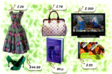 Look at the pictures and say what their prices are. Example: The dress costs twenty-five pounds.