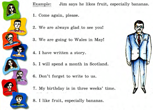 - He says they are going to go to Wales in May. (Он говорит, что они собираются поехать в Уэльс в мае.)