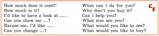 Do you remember some phrases people use when they talk at the shops? If not, look at the list below.