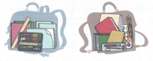 На первой картинке можно увидеть сумку со школьными принадлежностями, такими как линейка, книги и пенал с ручками и карандашами. В сумке также есть две линейки, и видно, что в ней много книг и есть бумага. Это соответствует Лизе, потому что она студентка университета, берёт с собой много книг, использует бумагу вместо тетрадей и носит линейки в сумке.