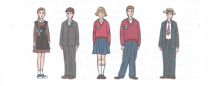 The uniform on the left looks formal and somewhat outdated: the girl is wearing a brown dress with an apron, and the boy is in a blue suit. The uniforms on the right are more modern, with a vest over a shirt for both the girl and the boy. I prefer the uniforms on the right, as they seem more comfortable and casual for school.