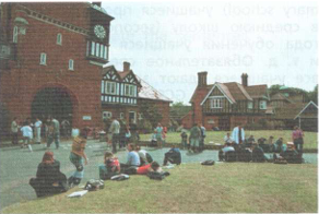 The school in the picture is quite large and beautiful. It has a lot of old buildings with brick walls and large windows. The pupils are sitting outside on the grass during their break. Some of them are talking to each other, while others are reading or playing games. The children are here because they are enjoying their free time after lessons. The weather is sunny and warm, making it perfect for spending time outdoors. The school yard is peaceful, and everyone seems to be having fun. The architecture of the school building is traditional, with some tall towers and sloping roofs, adding to the charm of the place.