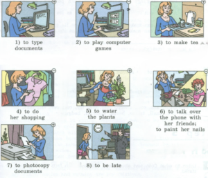 Mr Harrison is instructing his new secretary. Look at the pictures and say what he wants/doesn’t want her to do in her working hours. Use would like/wouldn’t like, expects/doesn’t expect.
