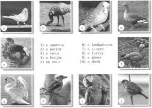 Артикль an используется перед словами, начинающимися с гласного звука. В данном списке это слово an emu (эму), так как первый звук [i:] — гласный. Слова goose (гусь) и duck (утка) часто путают: на картинке d изображен гусь (более длинная шея, стоит на земле), а на картинке f — утка (в воде). Budgie — это сокращенное название для волнистого попугайчика (budgerigar), в то время как parrot — общее название для крупных попугаев.